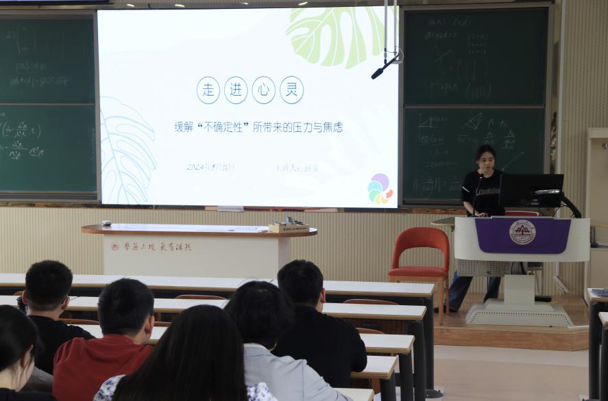 “走进心灵”主题讲座在电教北楼201举办。学院辅导员封莹以“缓解‘不确定性’所带来的压力与焦虑”为主题进行说明,学院2023级本科生参加讲座。