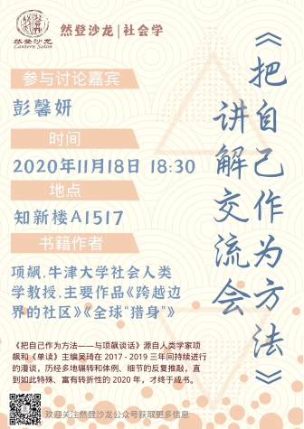 11月18日晚上,本期然登沙龙读书会以今年出版的新书——人类学家项飙与记者吴琦历时三年完成的谈话录《把自己作为方法》为主题书目,召开“《把自己作为方法》讲解交流会”。本期社会学沙龙邀请到人类学系的彭馨妍老师作为特邀参与嘉宾带领同学们就《把自己作为方法》,与来自bet007足球比分