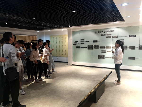 首先,在讲解员的引导下,同学们先看到了山东大学发展史展板。百年山大起源早,发展快,规模大,于1901年成立的官立山东大学堂。随社会变革更名,停办,重建,合校,搬迁与汇纳,最终成为了现在这所山东大学,厚重丰富光辉的历史,让同学们频频驻足,细细观摩。随后,新生们见到了学校不同发展时期的伟大校友,海洋研究奠基人童第周、人民艺术家老舍、舍身为国的革命家闻一多、两弹元勋丁肇中,都激励了同学们沿着他们的足迹拼搏奋斗,也更让同学们领略到了百年山大的风采与学无止境,气有浩然的真正意义。最后,大家见到了新世纪的山东大学。这个向双一流迈进的山东大学,这个充满青春活力、开拓创新、为伟大中国而奋斗的山东大学,同学们也认识到了自己奋斗的目标:为新时代的中国建设献出属于山大学子的一份力。