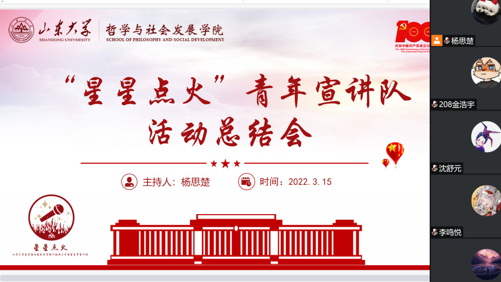 “星星点火”党的十九届六中全会精神青年宣讲团于线上召开活动总结会,就过去一个半月以来团队的社会实践情况进行了梳理与总结。