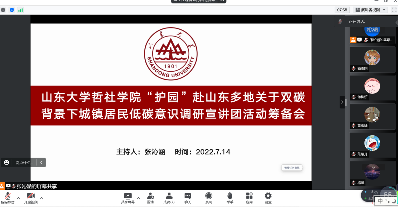 “护园”赴山东多地关于双碳背景下城镇居民低碳意识调研宣讲团在腾讯会议上召开暑期社会实践活动筹备会。队长张沁涵主持,来自哲学、社会学、新闻学专业的6名团队成员参与。