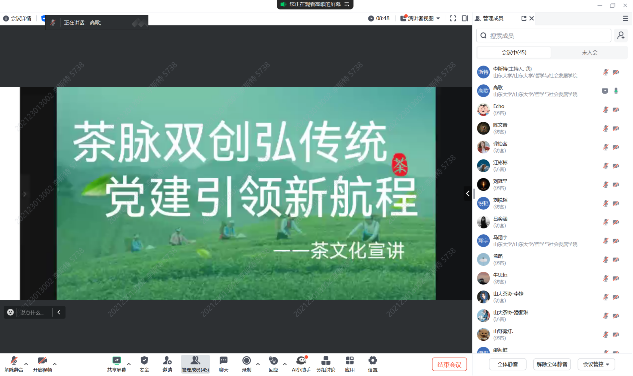 “星火”学生党员先锋队成功举办了一场别开生面的线上茶文化宣讲会。本次活动旨在弘扬中华优秀传统茶文化,促进文化创新与交流,吸引了包括山东大学茶文化协会代表在内的五十余名学生及茶文化爱好者积极参与,共同探索茶文化的深厚底蕴与现代价值。