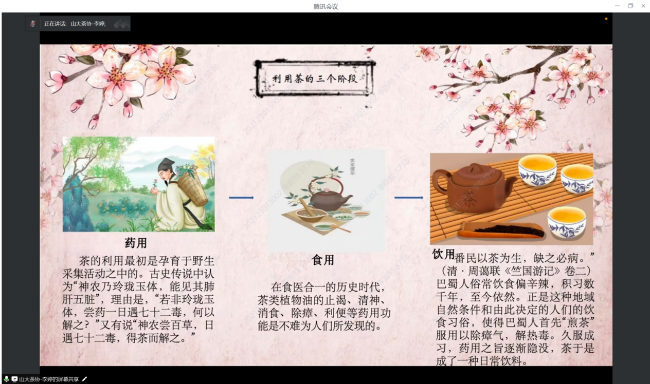 随后,山东大学茶文化协会代表李婷上台,详细介绍了协会的发展历程、组织架构、特色活动及未来规划。协会自成立以来,始终致力于茶文化的普及与推广,通过举办茶艺表演、茶文化讲座、茶山采风等多种形式的活动,不仅丰富了校园文化生活,也促进了学生对传统文化的认知与热爱,展现了新时代青年对传统文化的传承与创新精神。