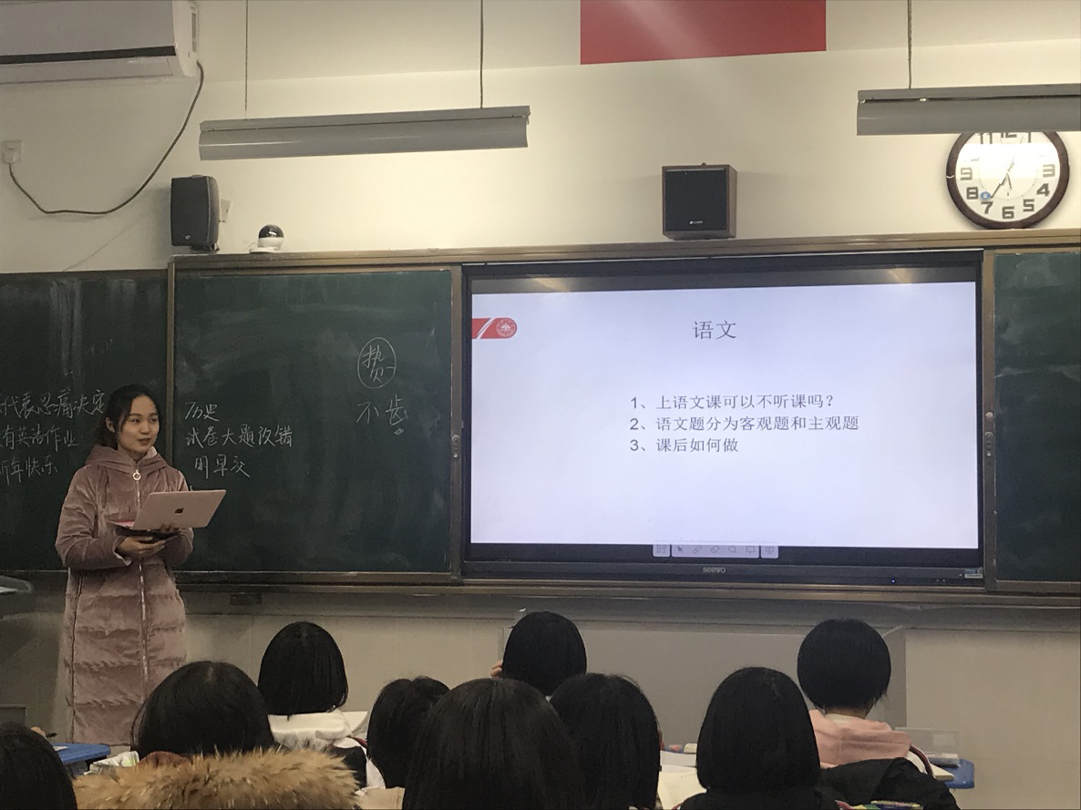 在事先与各班主任沟通交流之后,陈曦和她的高中同学于1月20号晚上来到学校开展了各自的宣讲工作。为了有效地实现与山东大学对接的招生,陈曦选择了(3)班、(6)班两个理科实验班与(13)班、(14)班两个文科实验班。学弟学妹们对于山东大学的招生政策和学校生活都产生了极其浓厚的兴趣,并且在宣讲之后就高中学习和报考大学主题提出了一系列问题,宣讲的大学生都一一给予解答。其中大部分问题都是关于高中数学、英语等科目的学习,也有许多学生对于个985、211高校的招生政策提出了具体的疑惑。