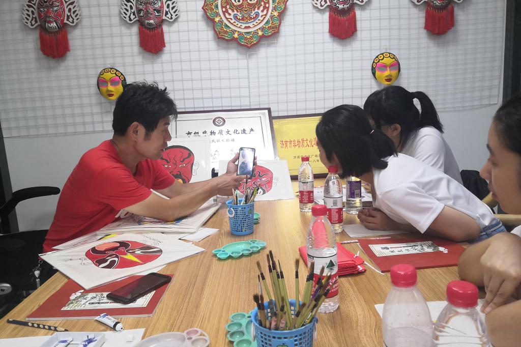 对我们的问题,传承人做了详细的回答。首先就社火脸谱近几年的发展做了一个简单的回顾。之前社火脸谱濒临失传,因为挣不到钱,没什么出路,家里的孩子也不愿意学。后来政府人员与传承人接触,希望可以好好保护社火脸谱这份非物质文化遗产,并传承下去。在与政府人员进行深入交流之后,传承人得到了政府的支持,因此出席了一些全国乃至国际非物质文化遗产保护会议,也将社火脸谱这一遗产推向世界。随着社火脸谱在非物质文化遗产保护中的重要性提高,文化保护专家对其越来越重视,但反观现实,社火脸谱的知名度还是不够,于是传承人与政府联系,得到了在趵突泉公园展示脸谱的许可,以一种接地气的方式在普通大众中宣传社火脸谱。