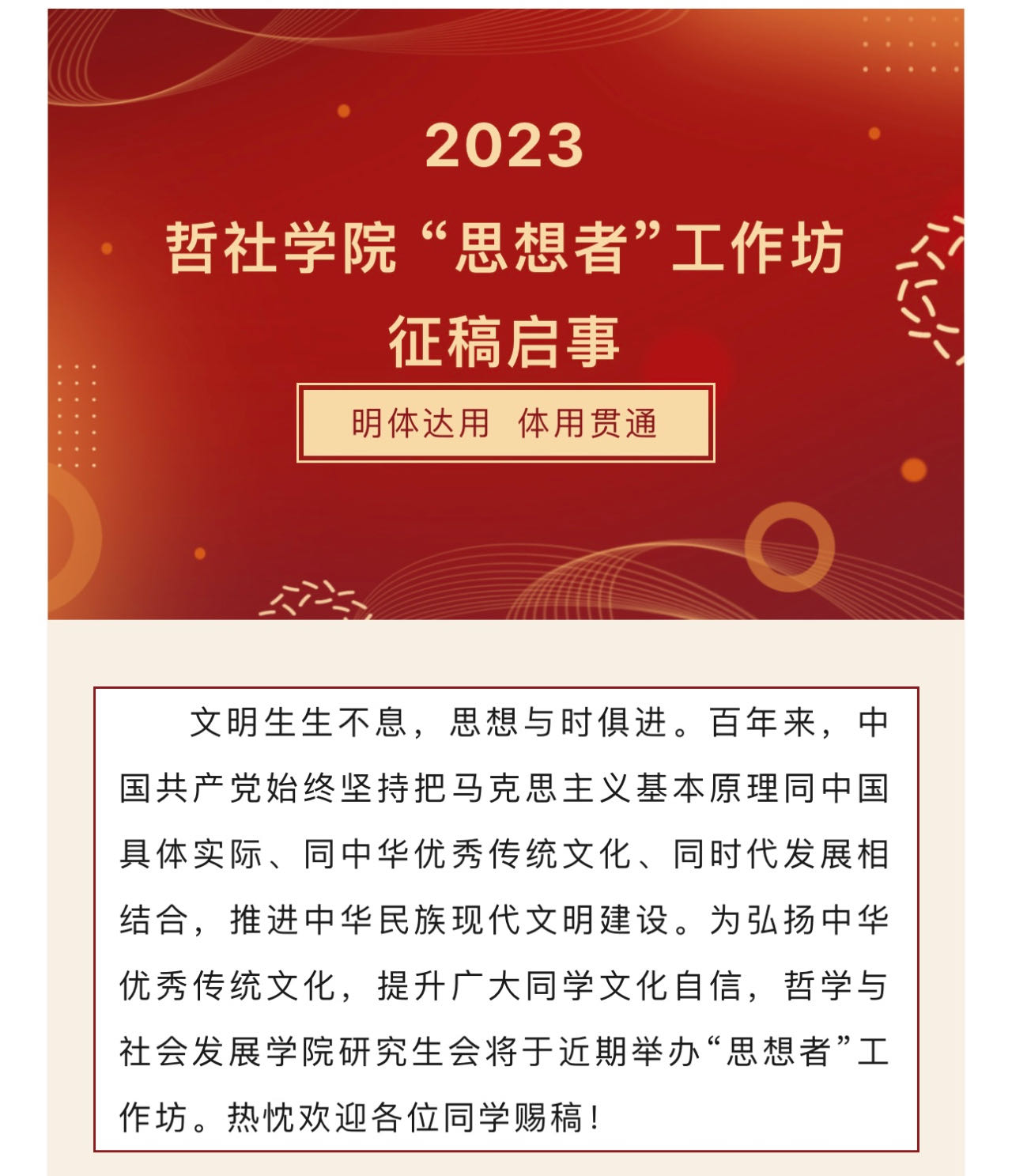 为传承山大文化血脉、发展特色哲社文化精心打造的文化品牌,成功入选学校“一院一品”文化建设项目。致力于通过阅典之知—— “吟典”经典文化诵读活动;启智之行—— “览岳”哲学本科生论坛;知行之路——社会学专业系列实地调研活动;嘤鸣之旅—— “融创哲社”创新创业系列品牌;学思之维——做实做强“思想者”等系列品牌,打造多层次、宽领域的立体化宣传矩阵,并结合哲社学院兼具思辨性与实践性的学科特色,塑造传播正能量,涵养山大基因,致力于为学校加快构建具有中国特色、中国风格、中国气派的哲学社会科学贡献哲社智慧,为丰富山大文化内涵、熔铸新时代山大精神做出现实贡献。