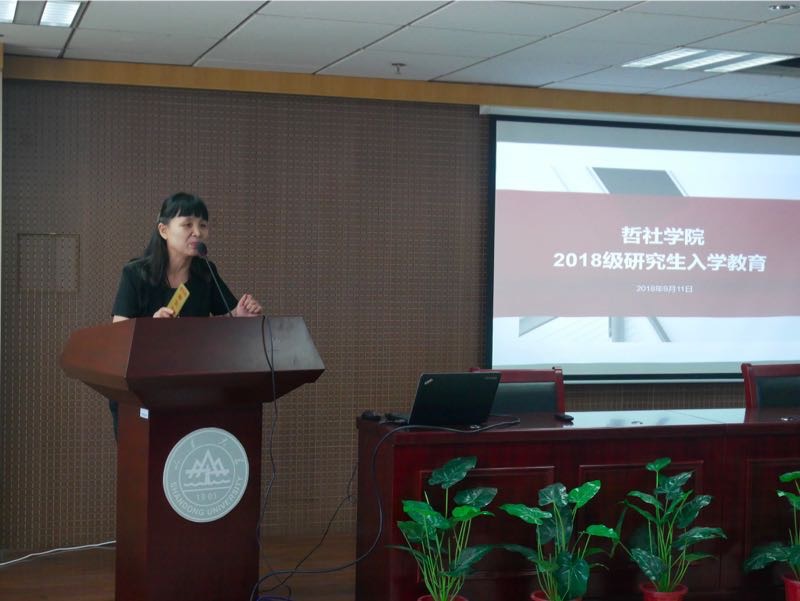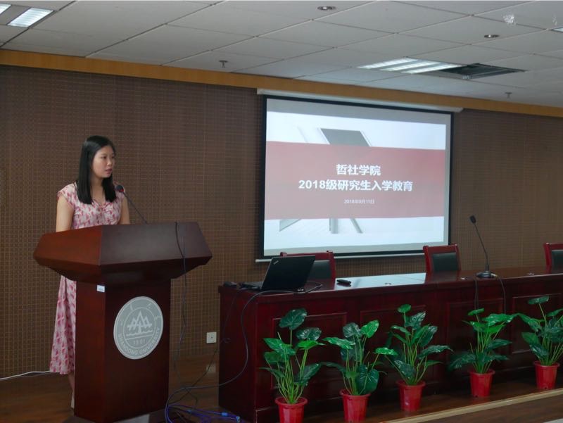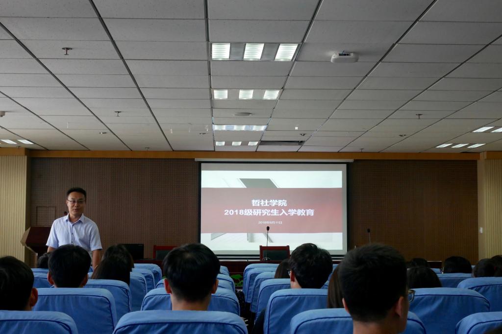 毛永强首先对2018级研究生的到来表示热烈的欢迎。他表示,研究生相对于本科阶段在学术和生活方面都有了更高的要求,对于同学们是一种压力,也更是一种动力。作为研究生新生,同学们应着眼敦品立学,沉潜学术、综合发展,明确个人发展规划和路径。他强调了“立业先立人”的重要性,希望同学们锤炼品格,与人为善,恪守学术道德和社会公德。毛永强还结合近日的社会热点问题,叮嘱各位同学注意个人的财产和人身安全,提高防范能力。陶莉从研究生生育管理规章制度和图书资料室的使用两方面进行了介绍。她首先向新生说明了研究生在读期间的生育制度,并强调了遵守规章制度的重要性。其次,她讲解了哲社图书资料室的馆藏、图书借阅和图书采购方法,并鼓励研究生同学在新学期能够多读书,提高学识,学院也会为同学们的阅读需求提供更高质量的服务。赵莹向新生同学详细讲解了研究生教学管理和培养的相关规定与政策,并就学生关心的培养计划制定、学分修读和前沿讲座等问题进行了细致的介绍和讲解。最后,姚蕊为同学们介绍了学校奖助勤贷的相关政策,并强调了学院日常管理的相关规定以及入学教育期间的活动安排情况。