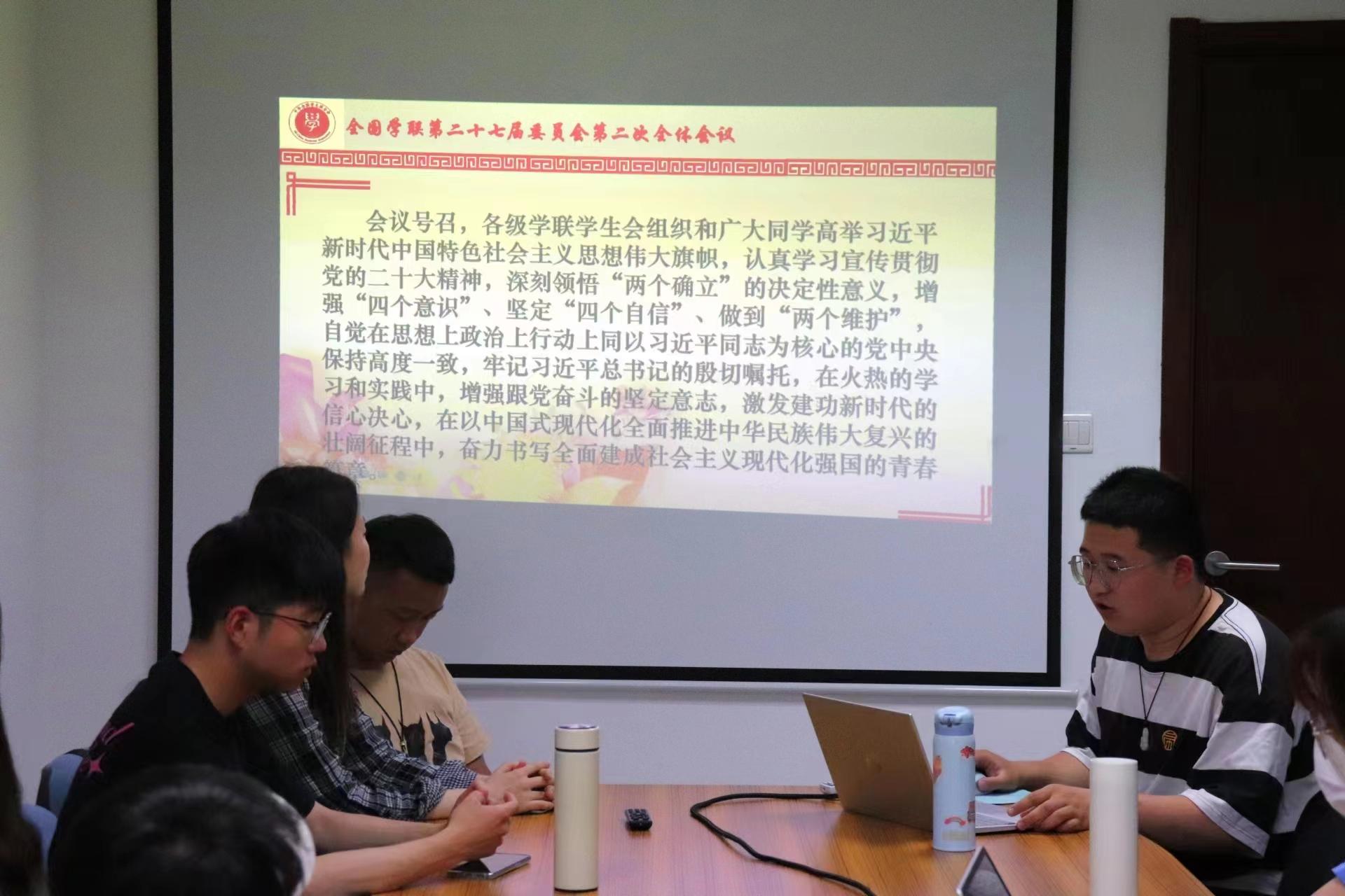 活动伊始,辅导员宋易儒老师以学联会议精神为主题提出建议,指出研究生会在学生工作中要进一步加强政治学习,有序开展“学习二十大、永远跟党走、奋进新征程”主题教育实践活动,同时深化“青年大学习”行动在学生中的影响力,帮助广大同学自觉做党的创新理论的坚定信仰者和忠实实践者。随后,研究生会主席陈滢如就全国学联第二十七届委员会第二次全体会议上的工作报告与主要学生干部进行讨论学习,从坚定理想信念、学生组织建设、服务同学宗旨、学生创新创业等方面进行广泛深入的学习。最后,各部门学生代表发表本次培训心得,各位同学从二十大报告学习的重要性、学生工作的创新性、学生的权益保障等方面发言,由办公室工作人员进行记录并对本次活动做出总结。