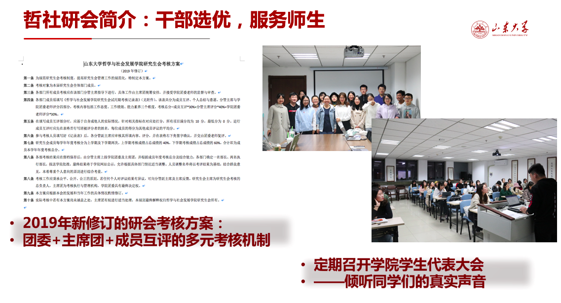 研究生培养的基本策略,也是研会的职责与初心。作为一个组织架构完善的研会,研会六大部门有明确的分工并形成了四个层级的组织架构。2019年,哲社研会重新修订了研会考核方案,建立多元考核制度,并定期召开学生代表大会,倾听来自同学们的真实声音。