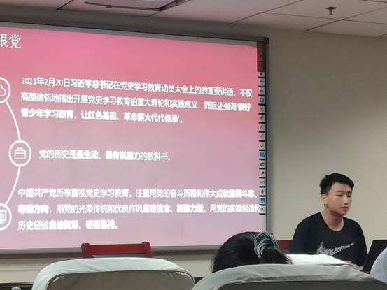 2020级社会学二班和哲学强基班在知新楼举行“听党史宣讲,忆百年传承”党史宣讲活动。活动邀请2019级本科生常张杰担任主讲,社会学二班和哲学强基班全体同学参加,团支书武妍主持。